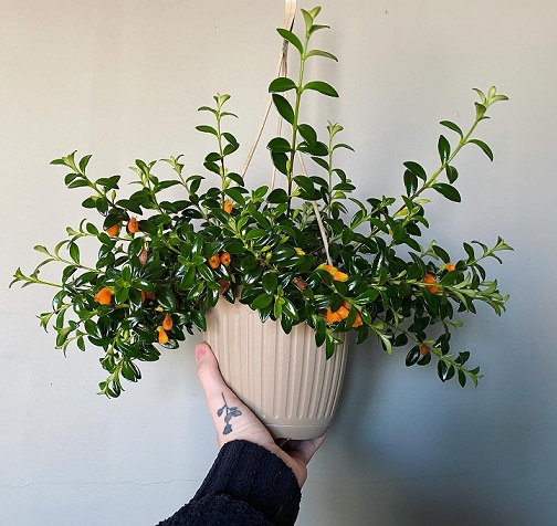Cây cá vàng có dạng thân thảo mềm, thường mọc rủ tự nhiên khi được trồng trong chậu treo. Lá của cây xanh đậm, hơi bóng, kích thước nhỏ vừa phải. Điểm đặc trưng nhất chính là hoa hình “cá vàng”, phồng lên như túi khí, màu cam hoặc đỏ nổi bật trên nền lá xanh thẫm.